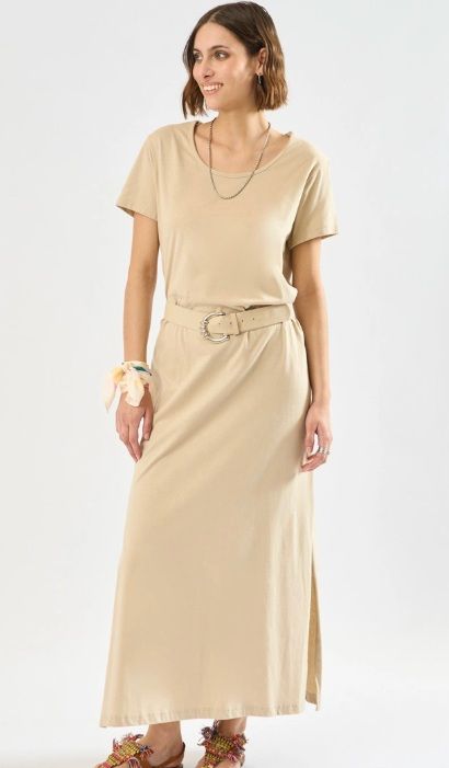 Posee cuello redondo, mangas cortas y tajos en los laterales.